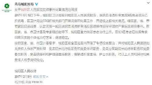 城阳区人民政府发布的《关于城阳区人民医院院感事件处置情况的通报》中称,2017年1月19日下午,城阳区卫计局接到城阳区人民医院报告,医院血液透析室发现9名患者感染乙肝病毒。经国家、省、市专家组现场调查,认定这是一起因该院血液透析室违反院感操作规程导致的严重医院感染事件。目前9名患者已按照专家组意见实施个体化治疗方案。