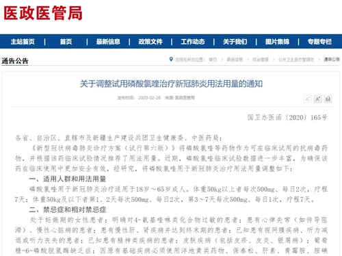 人民网北京2月29日电(董童)国家卫生健康委于28日在官网发布了《关于调整试用磷酸氯喹治疗新冠肺炎用法用量的通知》(以下简称“通知”)提出,新型冠状病毒肺炎诊疗方案(试行第六版)》将磷酸氯喹等药物作为可在临床试用的抗病毒药物,并根据该药物临床试验情况推荐了用法用量。