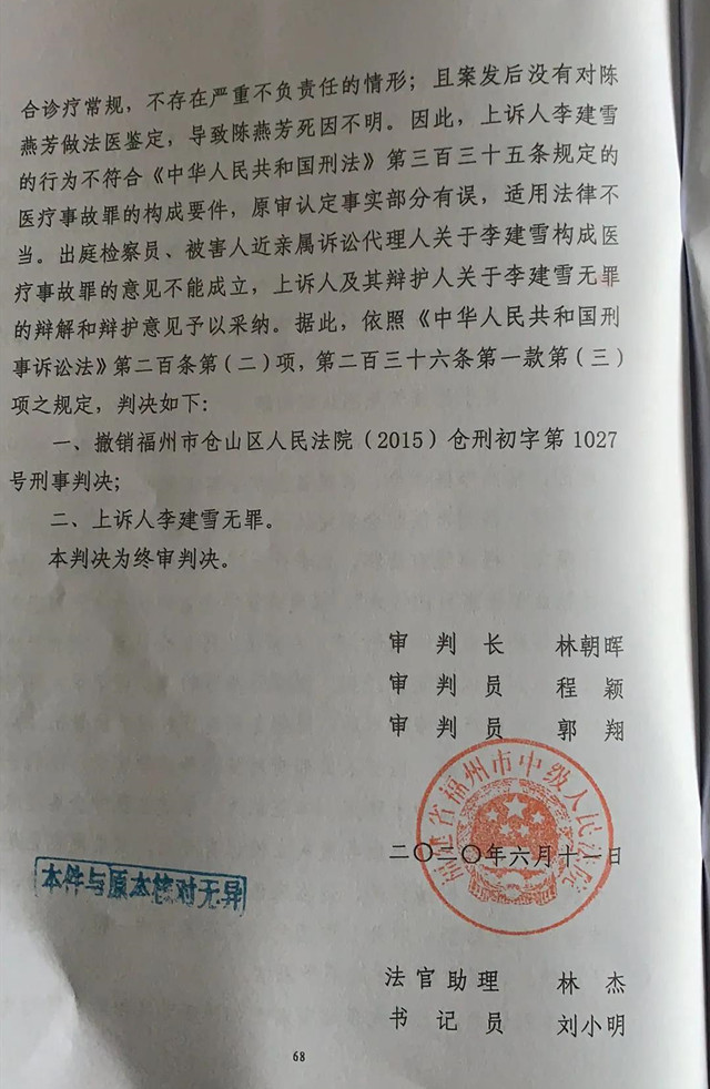 2020年6月11日,福建省福州市中级人民法院作出终审判决,宣判李建雪医生无罪!