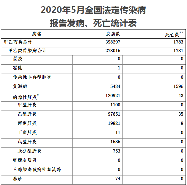 2020年5月(2020年5月1日0时至5月31日24时),全国(不含香港、澳门特别行政区和台湾地区,下同)共报告法定传染病398297例,死亡1783人。