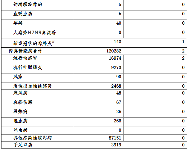 同期,丙类传染病中丝虫病无发病、死亡报告,其余10种丙类传染病共报告发病120282例,报告死亡2人。报告发病数居前3位的病种依次为其他感染性腹泻病、流行性感冒和流行性腮腺炎,占丙类传染病报告病例总数的94%。